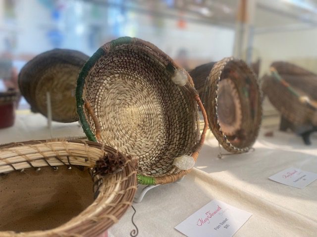 Mary learned the art of pine needle basket weaving from a Bahamian mentor and incorporates her own embellishments of colorful thread, glass beads, shells, and more.