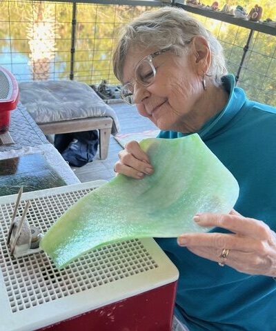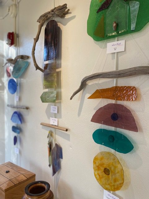 Susan has spent her life floating as an aerial artist. From her free spirit, driftwood sticks, and colored glass come her eye-catching (and sun-catching) wall- and window-hanging art.